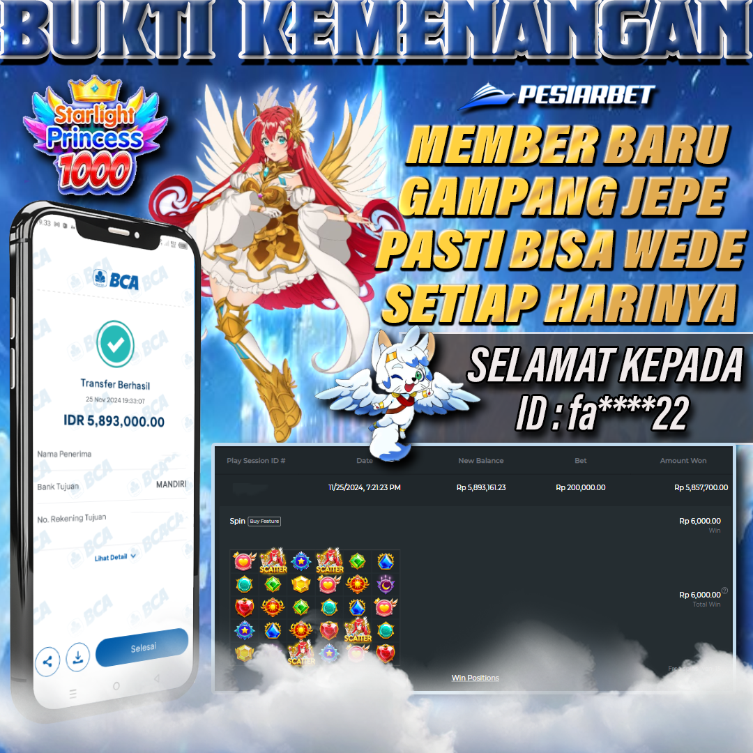 Selamat Kepada Id : FA***22 Atas Withdraw Rp 5.893.000 Juta Hari ini. Ditunggu Withdraw Selanjutnya dan ajak juga teman temannya bergabung di Pesiarbet